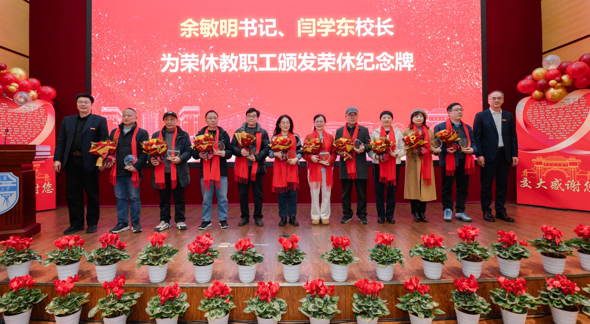 晏启祥宣读2025年121位荣休教职工名单。余敏明、闫学东为荣休教职工颁发荣休纪念牌。