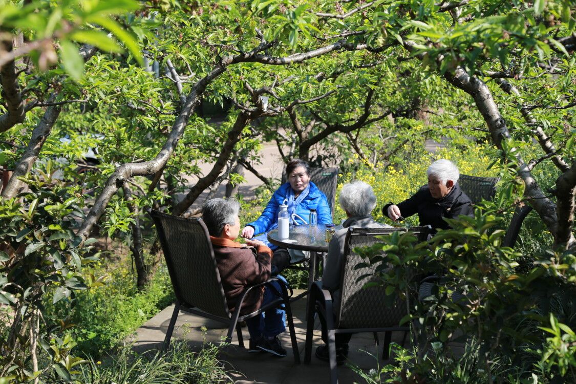 我们的大部队落脚于杏花村的盐亭居农家乐。有的老同志兴致勃勃地购买新鲜的土鸡蛋、土鸭蛋、土鹅蛋、椿芽;有的老同志相约而坐,在露天茶坊里聊天、下棋、打牌;有的爱好钓鱼的老同志,急切的走进碧波荡漾的杏花湖,感受垂钓的乐趣;有的结伴而行感受杏花村的美景。周边的杏林绿意盎然,小小的杏儿悄悄挂在枝头,枝杈交叉错接,春日暖暖的阳光透过层层花枝,洒下斑驳的光影。只见树上鸟儿飞,树下雄鸡走,树旁溪水淌,水中鱼儿游,悠闲于如斯美景,让人好不惬意,同时也营造了一幅人与自然相融相生的谐美画卷。