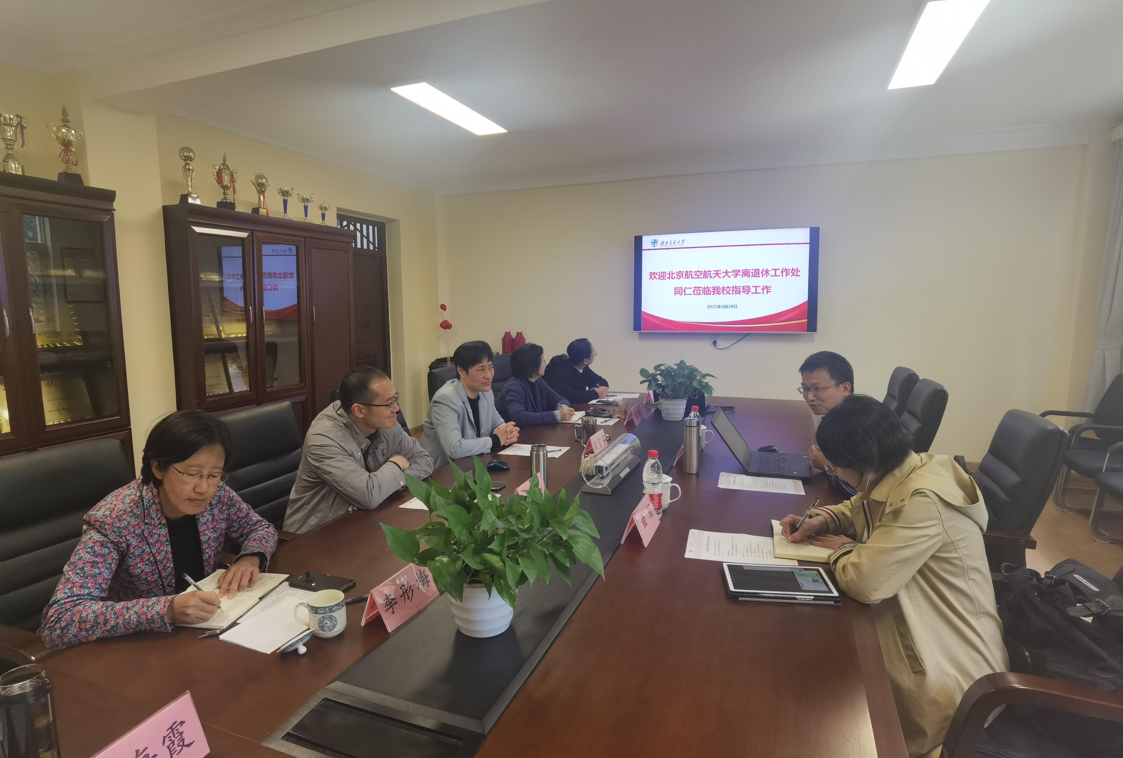 2021年4月20日下午,北京航空航天大学离退休工作处一行来我校开展离退休工作调研。离退处领导班子和工作人员共7人参加会议,会议由我校离退处党委书记段雪芬同志主持。