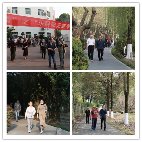 离退休老同志走出家门,迎着春日暖阳,湖波绿柳,绕着九里校区镜湖,犀浦校区人工湖环行健走。