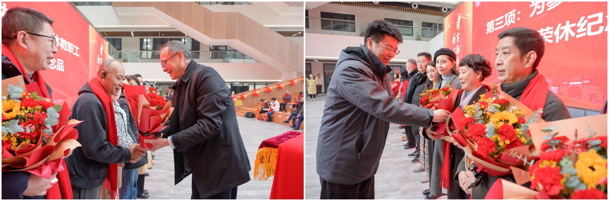 仪式上还播放了荣休教职工风采主题片《交大记忆》和离退休工作处精心制作的主题片《晚晴时光》,学生代表送上诗朗诵《美丽教师 美丽心灵》向荣休教职工致敬,活动在全体合唱校歌声中落下帷幕。