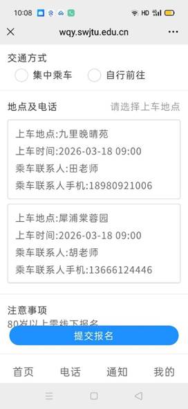 1.本次活动报名参加。本次出行分九里校区晚晴苑、犀浦校区棠蓉园两个上车点,报名时请各位老同志务必明确填报上车地点,以便确定两校区乘车座位数,填报后原则上不做更改。