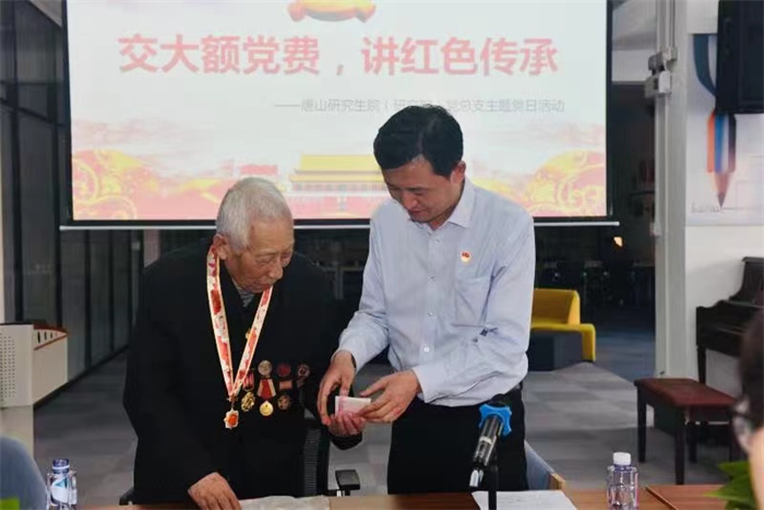 5月13日下午,唐山研究生院(研究院)党总支举办了一次特别的主题党日活动:耄耋党员张恩臣老师为党庆生,向党组织交上了一笔特殊的党费。唐山研究生院(研究院)师生党员代表参加此次活动。